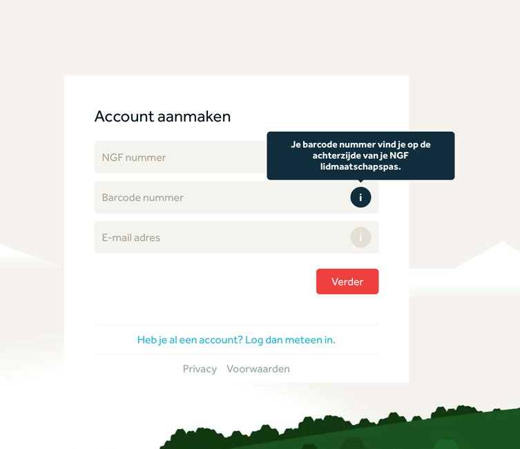 Voor het aanmaken van een account heeft u de volgende gegevens nodig, uw NGF nummer, een barcode nummer en uw email adres.